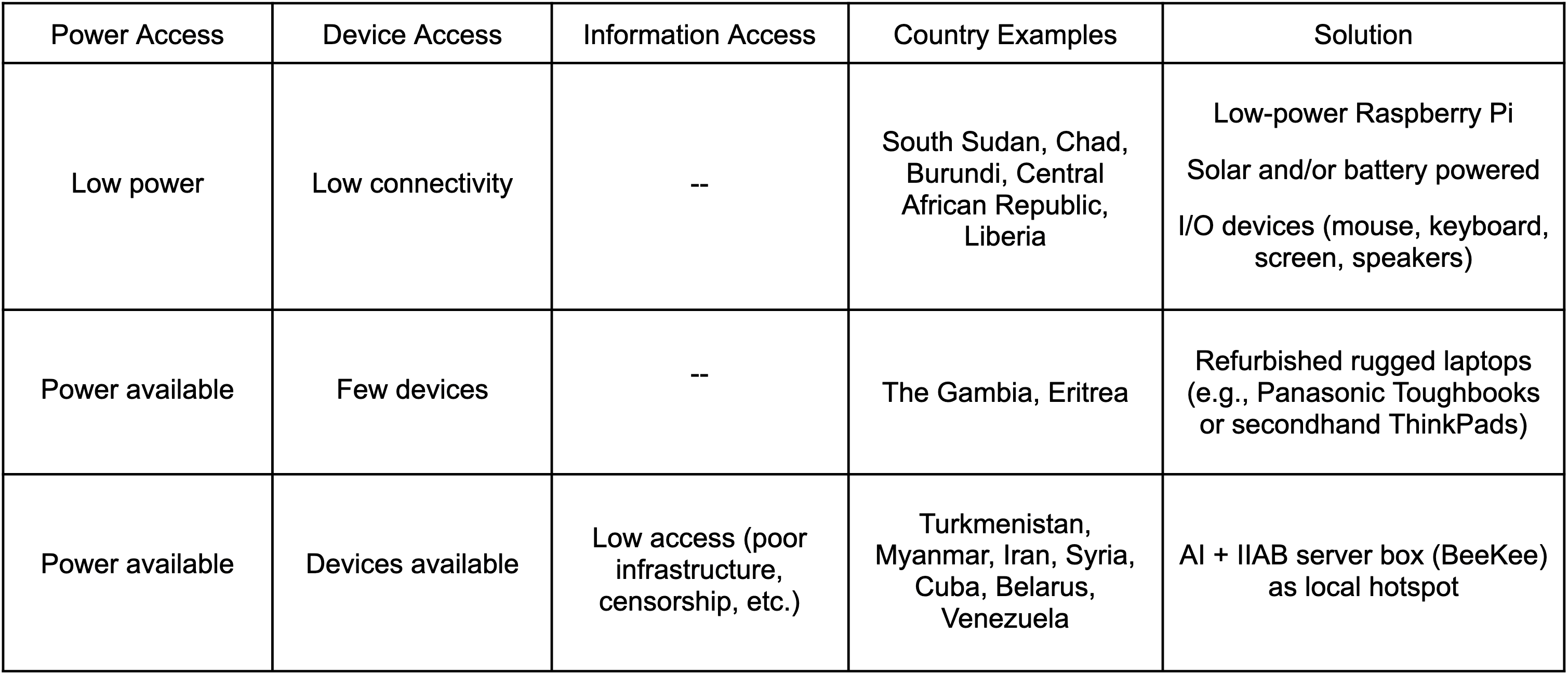 Devices & Power, Low Information Access: There are a few countries and regions where both device ownership and reliable electricity are common, but information access is not. Areas like Iran, Venezuela, and Turkmenistan struggle with poor internet infrastructure or selective censorship. In these communities, a Raspberry Pi or a stronger computer (like the BeeKee) could act as a local hotspot for individuals to connect to with their own devices. Hotspots are cheaper, more resilient, and more efficient for these regions compared to purchasing separate, new devices (as long as such devices are correctly configured to avoid remote monitoring in areas of censorship).